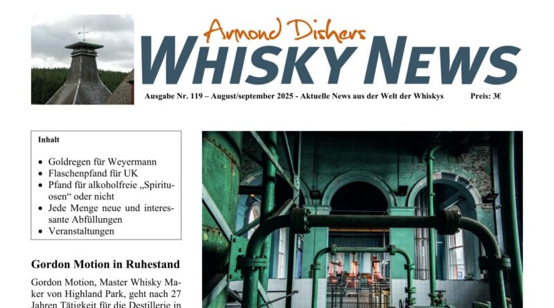 Gordon Motion, Master Whisky Maker von Highland Park geht nach fast dreißig Jahren Tätigkeit für die Destillerie auf Orkney in den Ruhestand. Die Bamberger Firma Weyermann hat mit ihren Bieren, Bränden und Whiskys gleich mehrfach Gold eingeheimst und die Frage, ob alkoholfreie „Spirituosen“ pfandpflichtig sind, ist noch immer nicht endgültig geklärt. Und bei neuen Abfüllungen kann man nicht von Saure-Gurken-Zeit sprechen. Jede Menge sind im Sommer herausgekommen. Und bei einem Zeitungsartikel in der Tagespresse habe ich mir die Frage gestellt, ob er nicht als Advertorial hätte gekennzeichnet werden müssen. All das finden Sie in der neuen ADWN.
